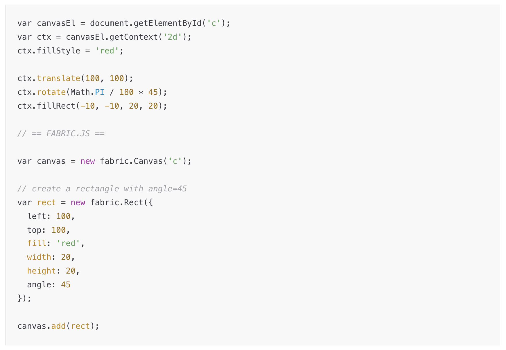 Fabric.js에서는 단순히 Fabric 의 Rect 객체를 생성하면서 angle 속성에 45도 각도 값을 지정했다.